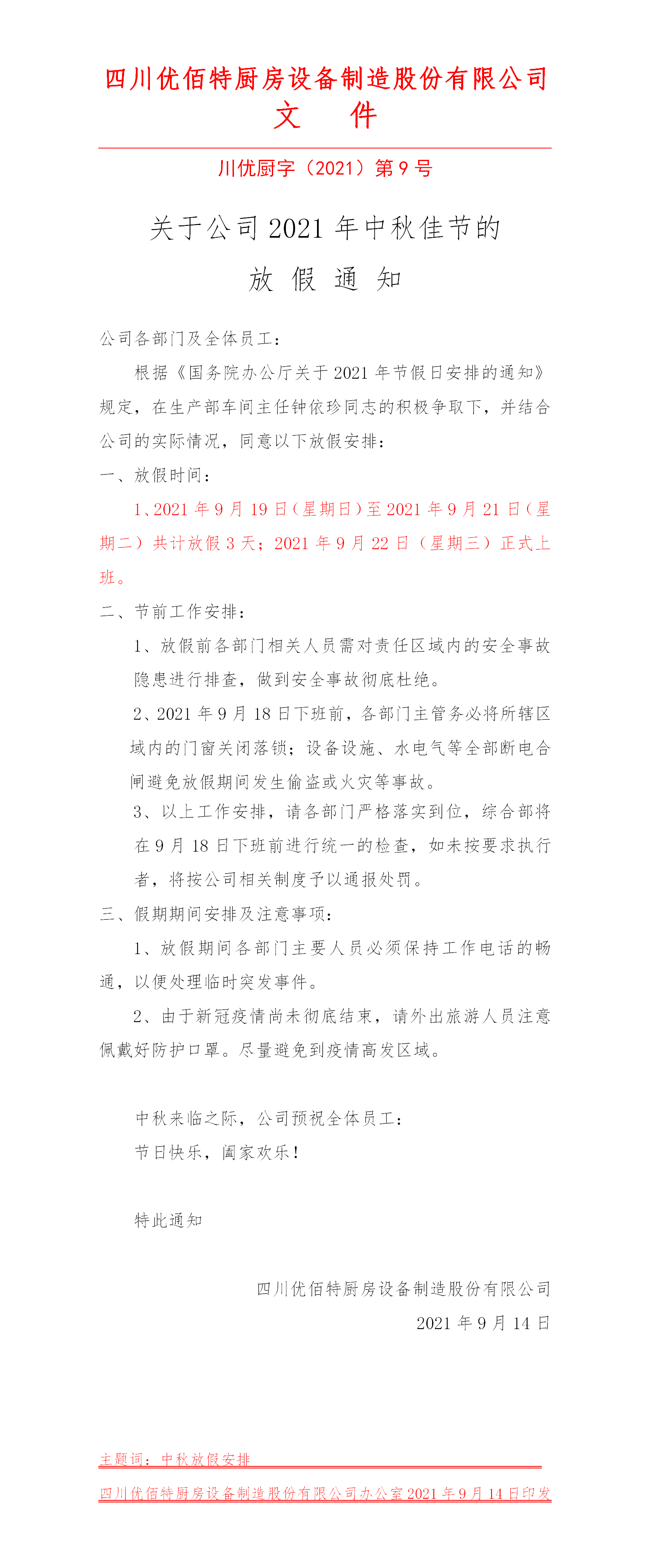 2021年中秋放假通知