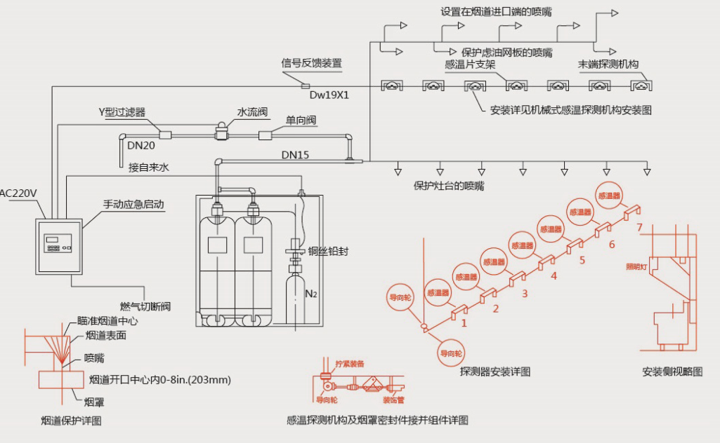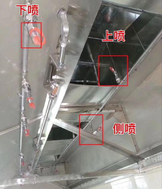 d.当系统药剂喷完大约2-5秒后,系统上的阀门自动将喷水阀门打开。水流通过灭火剂管道和喷嘴喷洒,迅速冷却和冲刷油料及灶台设备表面。
